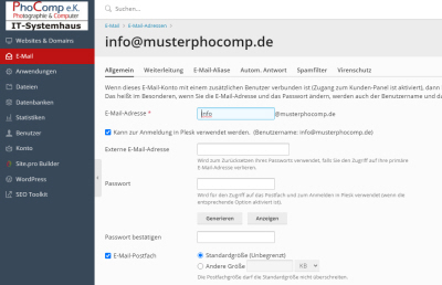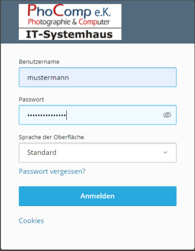 Mit den Zugangsdaten, welche wir Ihnen per SMS zusandten, können Sie sich jetzt einloggen und sich selber NEUE PASSWÖRTER, unter anderen für die eMail-Konten einrichten und DOKUMENTIEREN.